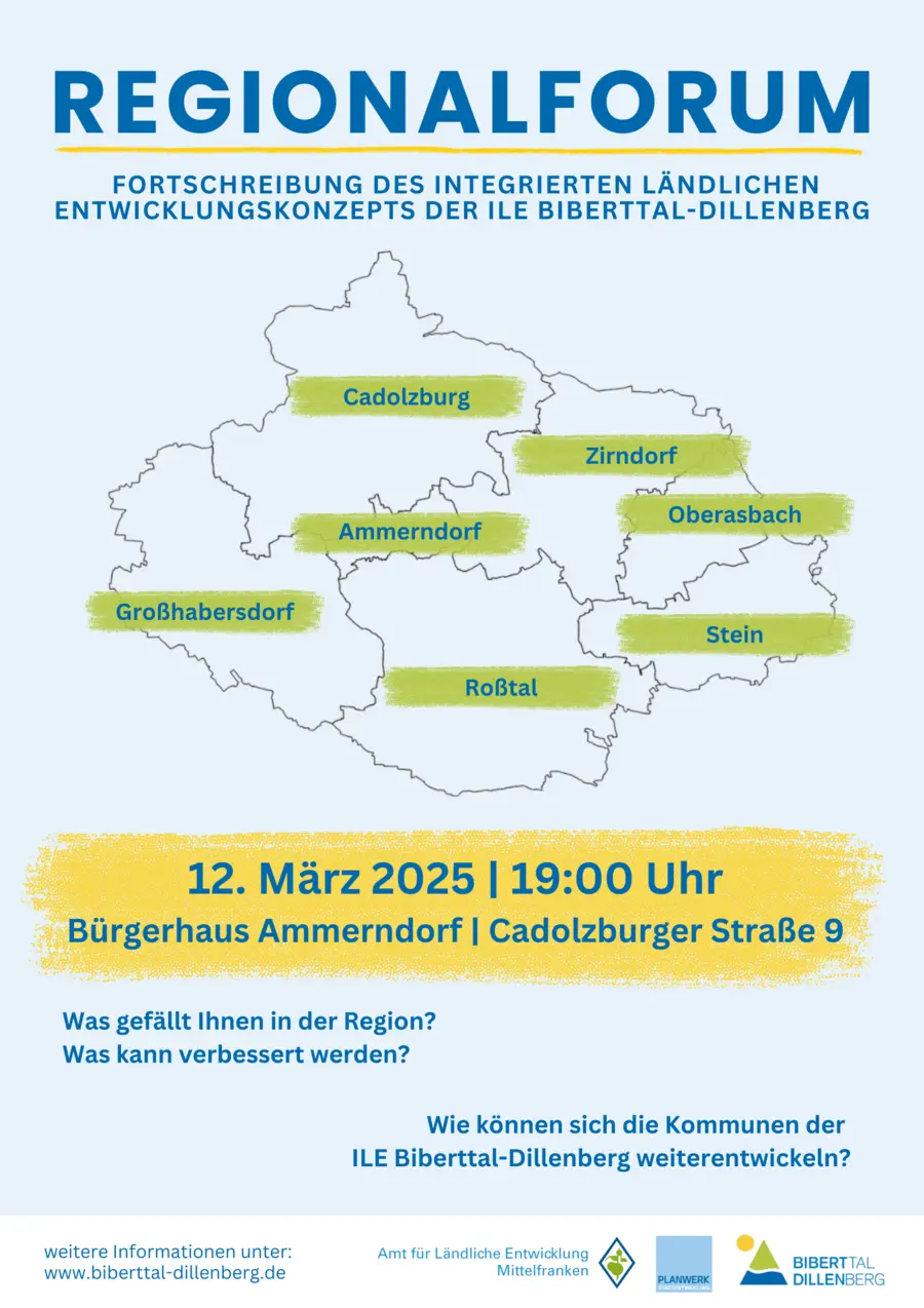 Im Rahmen der Fortschreibung des Integrierten Ländlichen Entwicklungskonzepts laden die Städte Oberasbach, Stein und Zirndorf, die Märkte Ammerndorf, Cadolzburg und Roßtal sowie die Gemeinde Großhabersdorf herzlich zu einem Bürgerregionalforum Mittwoch, 12. März 2025, um 19.00 Uhr ins Bürgerhaus in Ammerndorf, Cadolzburger Straße 9, ein.