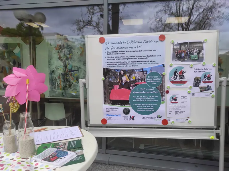 Dann ermöglichen Sie im Team Menschen mit eingeschränkter Mobilität klimafreundliche Fahrten mit einer Fahrrad-Rikscha mit E-Motorantrieb z.B. ins Grüne! Das Projekt "Radeln Oberasbach" von Quartiersmanagement der Diakonie Fürth in Oberasbach und Stadt Oberasbach wird unterstützt von United Kiltrunners Fürth e.V. und Radeln ohne Alter Deutschland e.V..