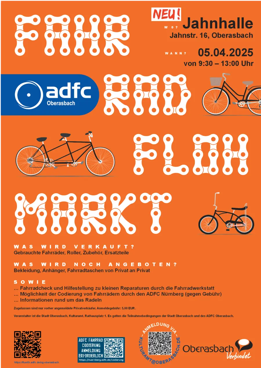 Mit der ADFC-Ortsgruppe und der Fahrradfreundlichen Kommune Oberasbach können Sie hier der Mobilitätswende kostengünstig nachhelfen. Darüber hinaus können Sie Ihr Rad zur Diebstahlprävention vor Ort codieren lassen (Anmeldung erforderlich unter nuernberg.adfc.de/codierung).