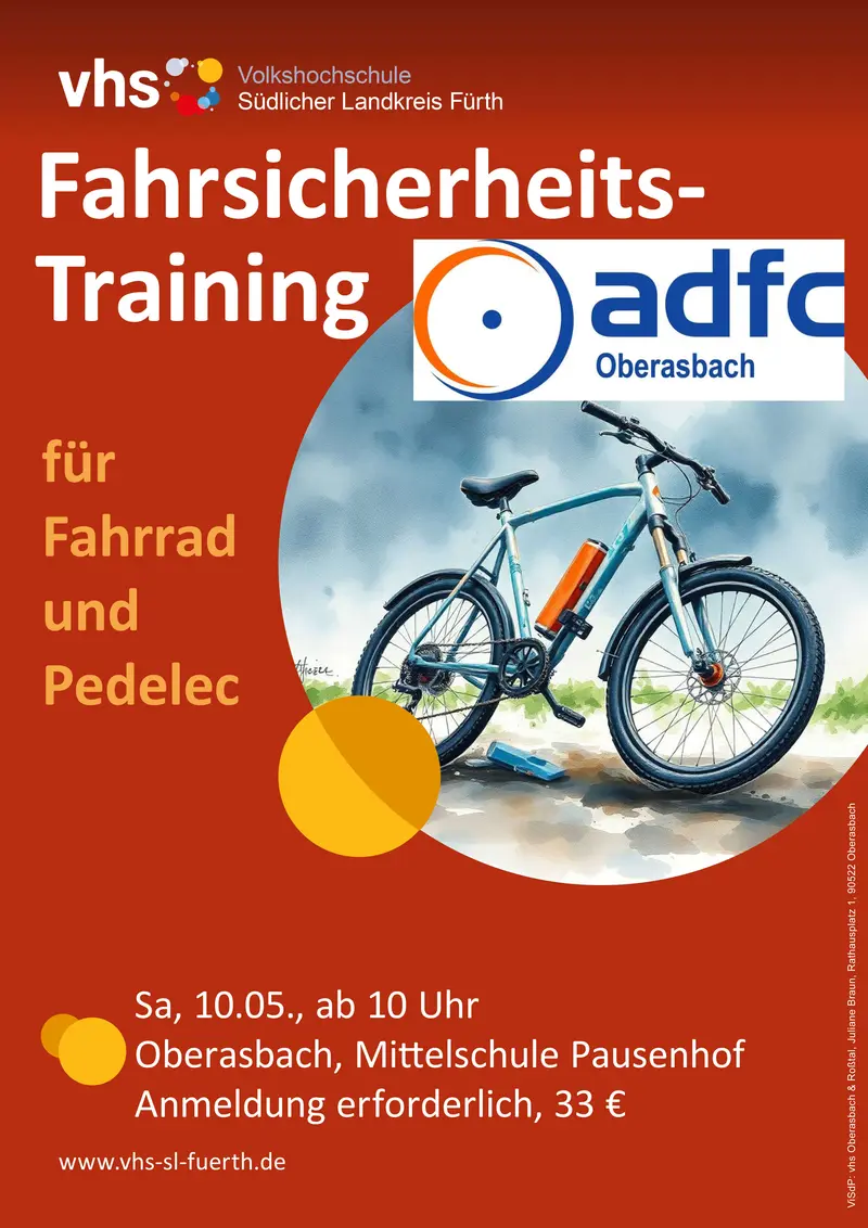 Der Kurs wird von zertifizierten, erfahrenen Trainerinnen und Trainern des ADFC durchgeführt (Kursleitung: Werner Struzyna und Isabella Weber). Mehrere Personen ermöglichen vor Ort eine möglichst individuelle Schulung. Bei starkem Regen findet die Veranstaltung nicht statt. Bitte Ihr verkehrssicheres Pedelec/Fahrrad, Helm (obligatorisch), wettergerechte Kleidung und Getränk mitbringen, eventuell Handschuhe und eine Stärkung für die Mittagspause. Die vhs Südlicher Landkreis Fürth und der ADFC haften nicht für Unfälle, die Teilnahme erfolgt auf eigene Gefahr.