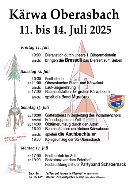 Die Kärwaboum Oberasbach haben entlang der Bachstraße wieder ein tolles viertägiges Programm organisiert. Ein Highlight ist hier der Stadt- und Kärwalauf unseres Kulturamts am Samstagvormittag (12. Juli).