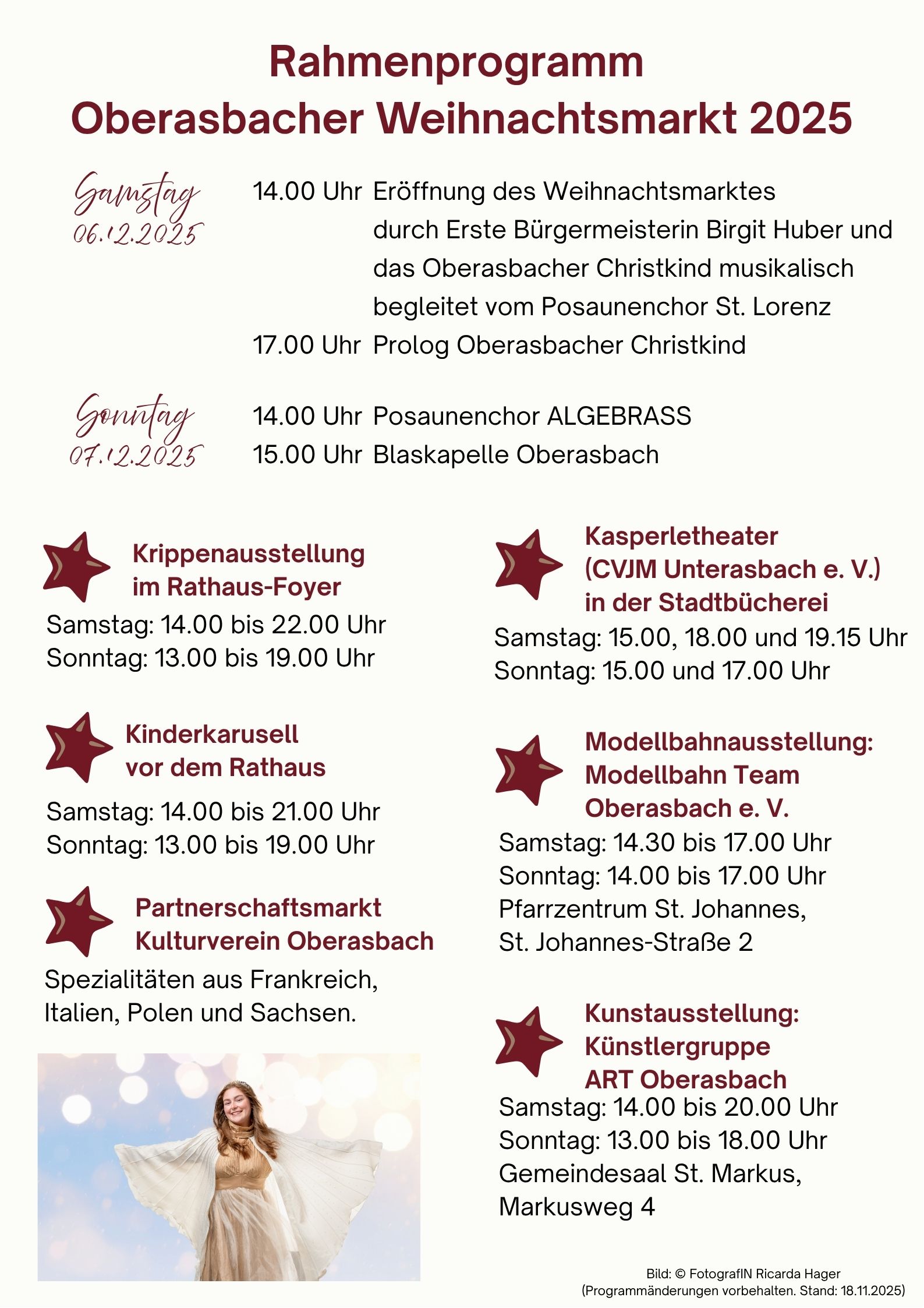 Bürgermeisterin Birgit Huber eröffnet den Markt am Samstag um 14 Uhr gemeinsam mit dem Oberasbacher Christkind und Vertretern der Partnerstädte. Den Prolog spricht das Christkind dann noch einmal am Samstag um 17 Uhr und verteilt anschließend gemeinsam mit dem Nikolaus Süßigkeiten auf dem Weihnachtsmarkt.