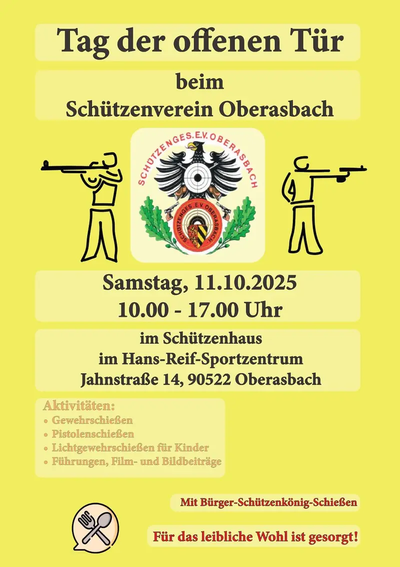 Der Schützenverein SG Oberasbach e.V., der 2025 sein 65-jähriges Bestehen feiert, lädt am 11. Oktober von 10.00 bis 17.00 Uhr zu einem Tag der offenen Tür ein.