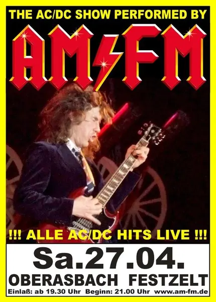 Im Rahmen des Stadt- und Bürgerfestes findet im Festzelt auf der Festwiese am Rathausplatz in Oberasbach am 27. April von 21.00 Uhr bis 23 Uhr ein Konzert der AC/DC-Tribute-Band AM/FM statt.