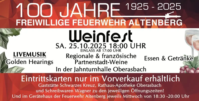 Das aktuelle Jubiläum „100 Jahre Freiwillige Feuerwehr Altenberg“ wird am 25. Oktober mit einem Weinfest in der Oberasbacher Jahnhalle gebührend gefeiert. Eintrittskarten gibt es nur im Vorverkauf, der bereits begonnen hat – schnell zugreifen, die Plätze sind begrenzt!