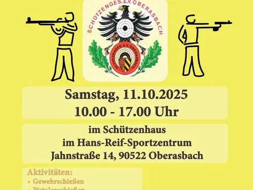Der Schützenverein SG Oberasbach e.V., der 2025 sein 65-jähriges Bestehen feiert, lädt am 11. Oktober von 10.00 bis 17.00 Uhr zu einem Tag der offenen Tür ein.