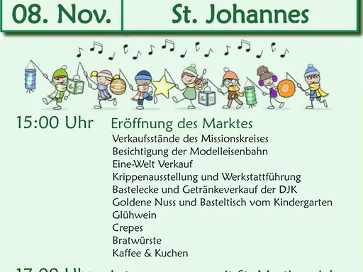 Am Samstag, 8. November lädt der gemütliche Martinimarkt von St. Johannes zu Glühwein, Crêpes, Bratwürsten, Kaffee und Kuchen und mehr im Pfarrhof ein.