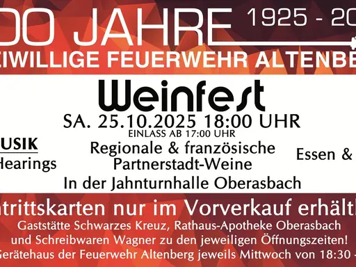 Grafik: (c) Bastian Ott, FF AltenbergDas aktuelle Jubiläum „100 Jahre Freiwillige Feuerwehr Altenberg“ wird am 25. Oktober mit einem Weinfest in der Oberasbacher Jahnhalle gebührend gefeiert. Eintrittskarten gibt es nur im Vorverkauf, der bereits begonnen hat – schnell zugreifen, die Plätze sind begrenzt!