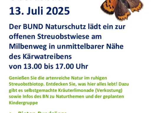 Seit 1992 pflegt der BUND Naturschutz Oberasbach die von der Stadt gepachtete artenreiche Obstwiese am Milbenweg in Alt-Oberasbach. Die Fläche wird sehr gerne von Grundschulen, Kindergärten und weiteren Gruppen zur Umweltbildung genutzt. Am Kirchweihsonntag, den 13. Juli 2025, öffnet die Ortsgruppe von 13.00 bis 17.00 Uhr das Kleinod für interessierte große und kleine Gäste.